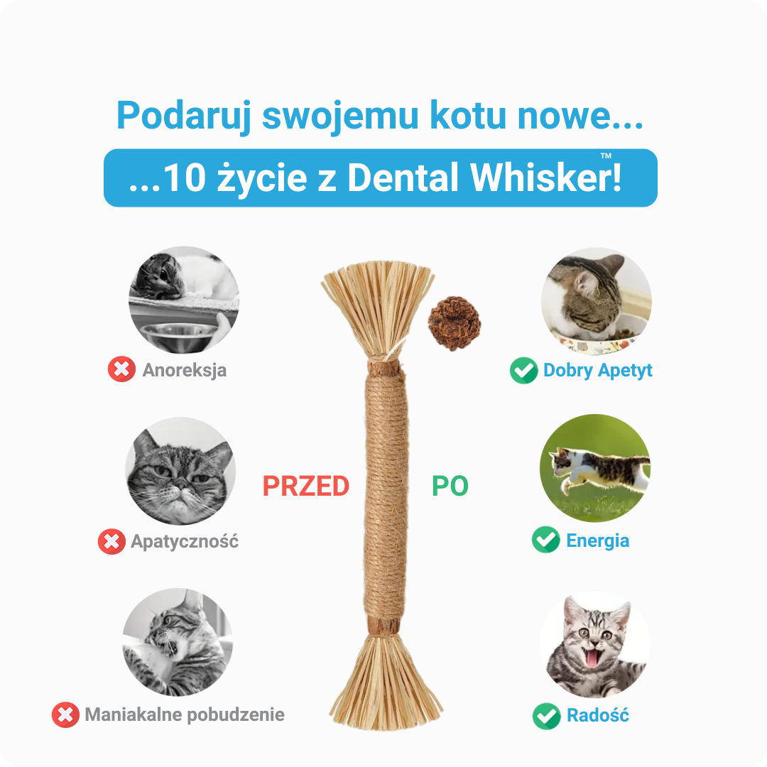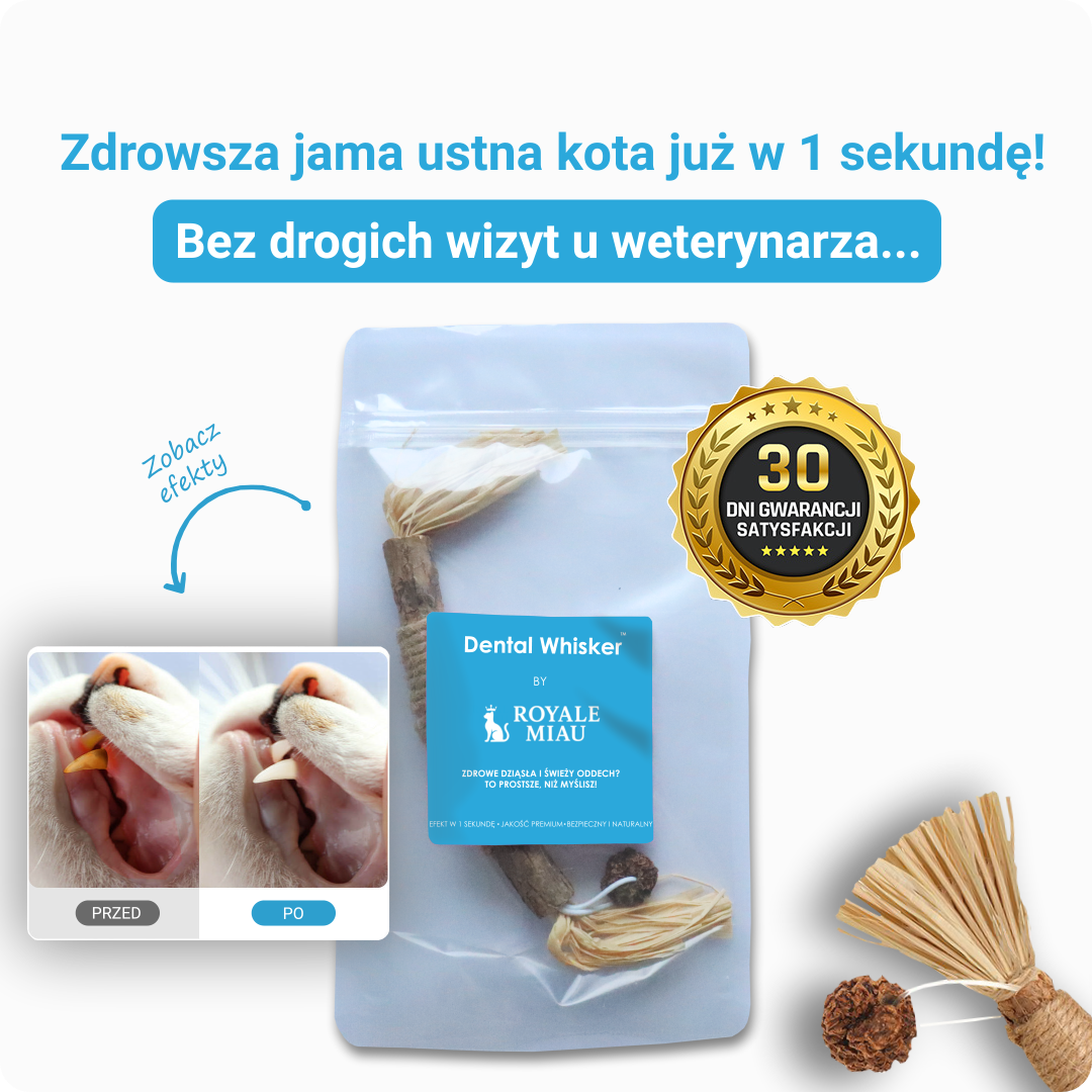 Zapomnij o kosztownych zabiegach dentystycznych i stresujących wizytach u weterynarza — Dental Whisker™ to naturalny sposób na zdrowy i mocny uśmiech Twojego kota!