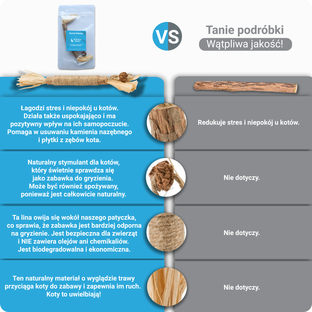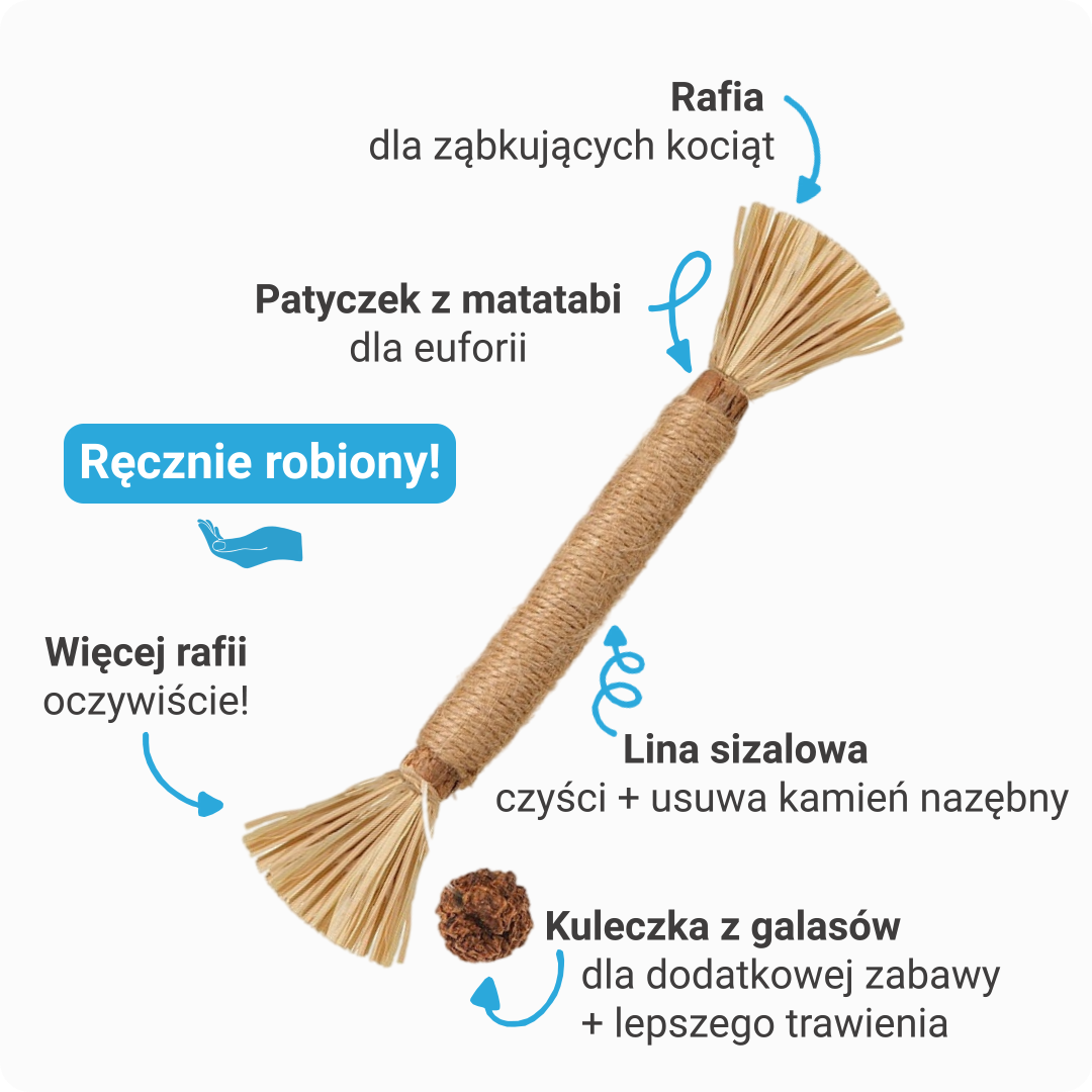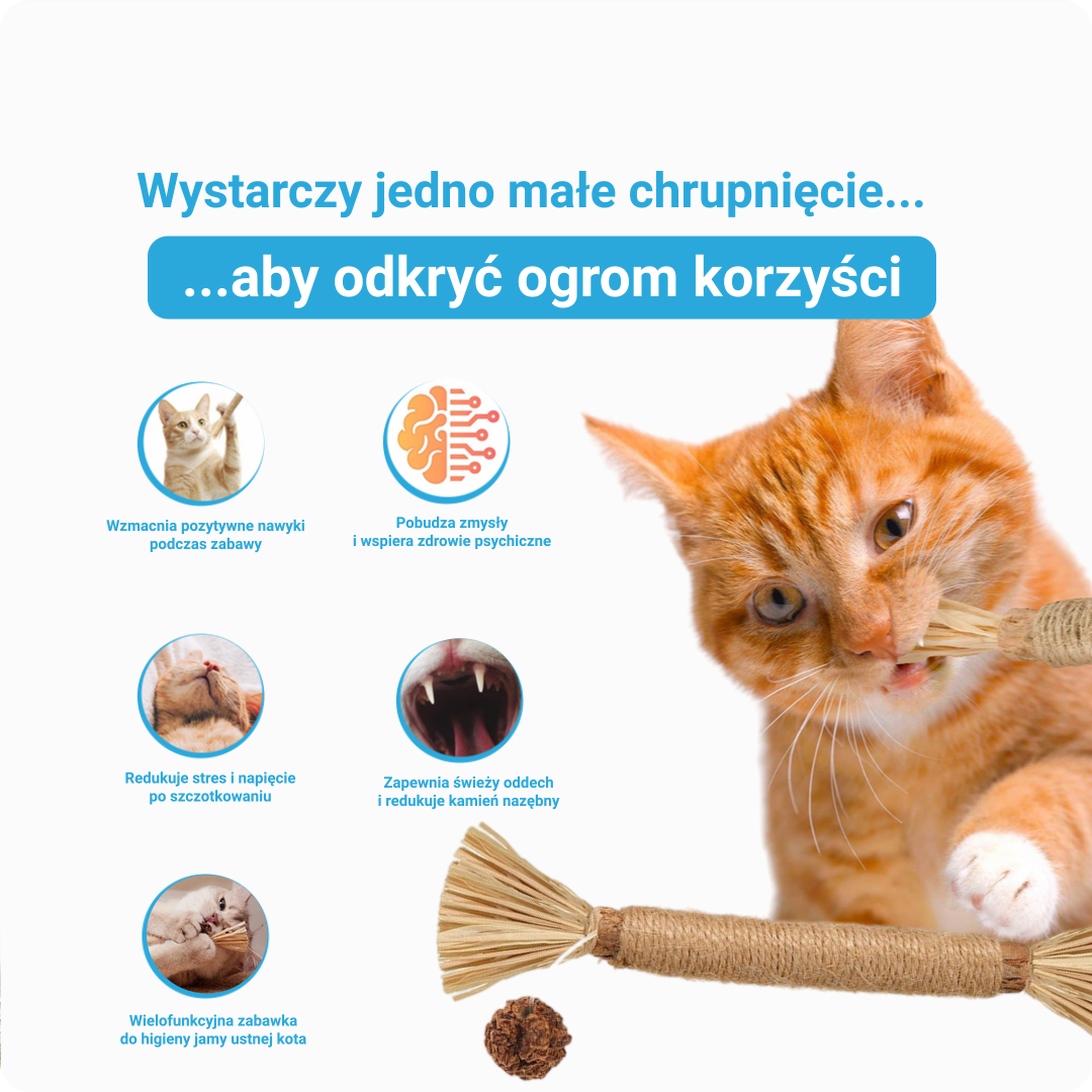 Dental Whisker™ to ręcznie robiony gryzak klasy PREMIUM z naturalnego matatabi i suszonego owocu, który w kilka chwil pobudza kota do zabawy, wspiera higienę jamy ustnej i zapewnia mu ekscytującą przygodę – idealny na każdy moment, kiedy liczy się szybka dawka frajdy i zdrowa aktywność.