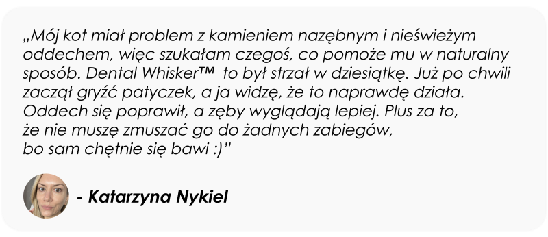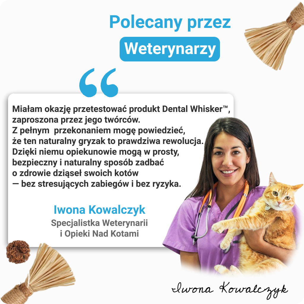 Miałam okazję przetestować produkt Dental Whisker™, zaproszona przez jego twórców. Z pełnym przekonaniem mogę powiedzieć, że ten naturalny gryzak to prawdziwa rewolucja. Dzięki niemu opiekunowie mogą w prosty, bezpieczny i naturalny sposób zadbać o zdrowie dziąseł swoich kotów — bez stresujących zabiegów i bez ryzyka. Najlepsze jest to, że poprawa zdrowia jamy ustnej jest zauważalna już po pierwszym użyciu”.